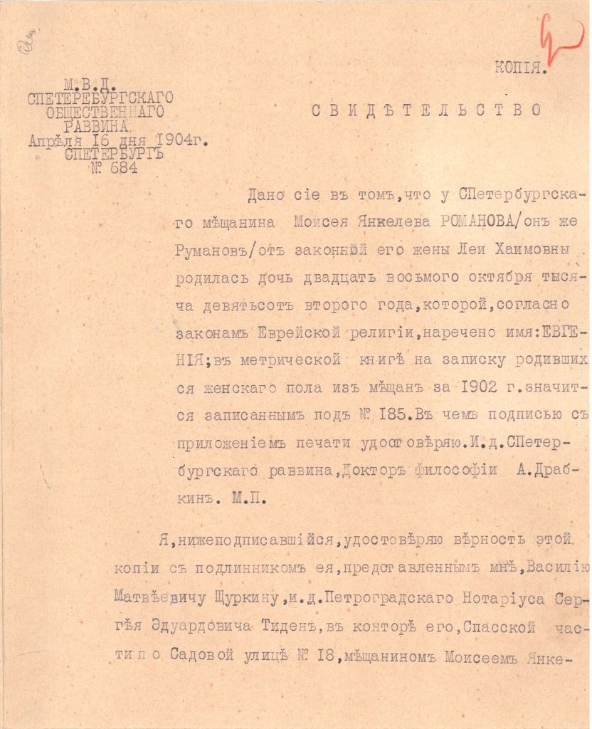 Дано cie въ томъ.что у СПетербургскаго мещанина Моисея Янкелева РОМАНОВА/онъ же Румановъ/отъ законной его жены Леи Хаимовны родилась дочь двадцать восьмого октября тысяча девятъсотъ второго года, которой, согласно законами Еврейской религии, наречено имя: ЕВГЕНIЯ;  въ метрической книге на записку родившихся женскаго пола изъ мъщанъ за 1902 г. значится записаннымъ подъ № 185.Въ чемъ подписью съ приложенiем печати удостоверяю.  И.д.СПетербургскаго раввина, Докторь философии А.Драбкинь. М.П.