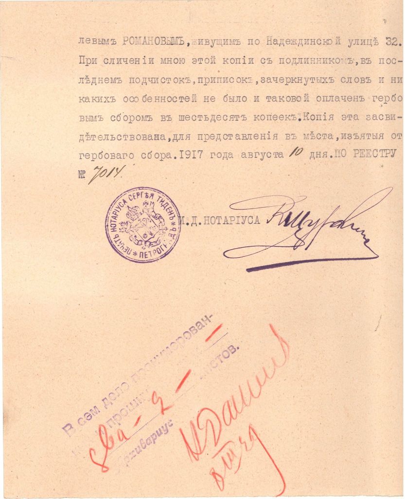 Я, нижеподписавшийся,удостоверяю верность этой копiи съ подлинником ея, представленншъ мне, Василию Матвеевичу Щуркину, и.д.Петроградскаго Hoтapiyca Сергея Эдуардовича Тиденъ, въ конторе его, Спасской части по Садовой улице №18, мещаниномъ Моисеемъ Янкелевымъ РОМАНОВЫМ, живущимъ по Надеждинской улице № 32. При сличении мною этой Koniи съ подлинникомъ, въ последнемъ подчистокъ, приписок, зачеркнутыхъ словъ и никакихъ особенностей не было и таковой оплаченъ гербовымъ сборомь въ шестьдесят копеекь. Koniя эта засвидетельствована, для представяенiя вь места, изъятия от гербоваго сбора.1917 года августа 10 дня. ПО РЕЕСТРУ №7014