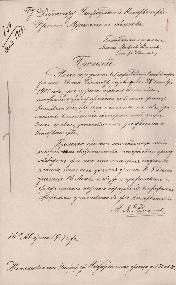 Желая определить в Петроградскую Консерваторию дочь мою Евгению Романову, родившуюся 28 октября 1902 года, для изучения игры на фортепиано, покорнейше прошу принять ее в число учениц Консерватории, при сем принимаю на себя ручательство в исполнении со стороны моей дочери всех правил, установленных для учащихся в Консерватории. Прилагаю при сём нотариальную копию метрического свидетельства покорнейше прошу освободить дочь мою от посещения научных классов, так как дочь моя учится в 5м классе училища Св.Анны, и обязуюсь представить к сроку окончания научного образования в пределах программы установленной для Консерватории.