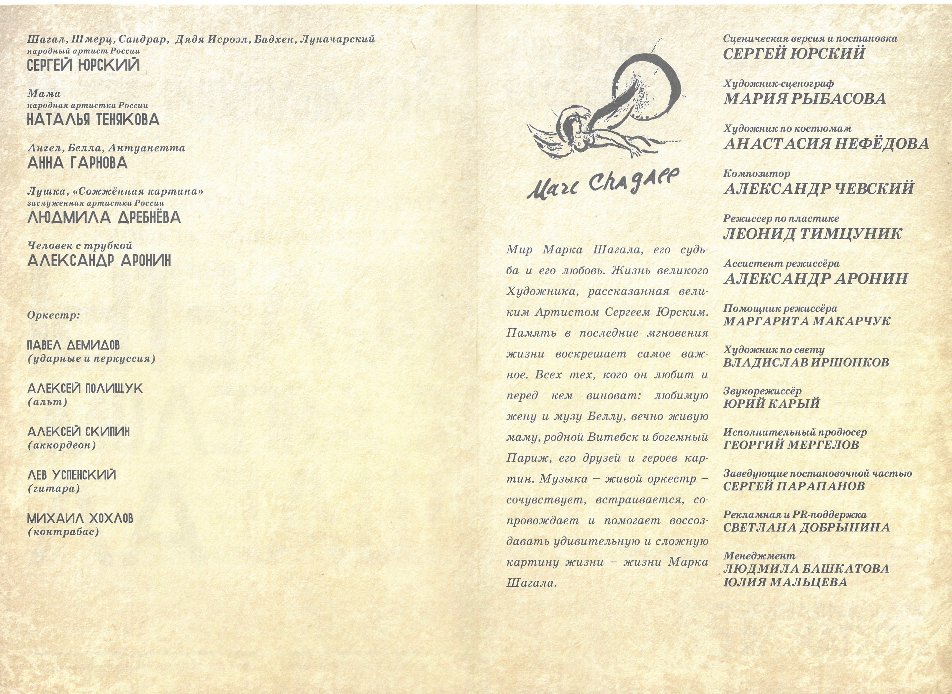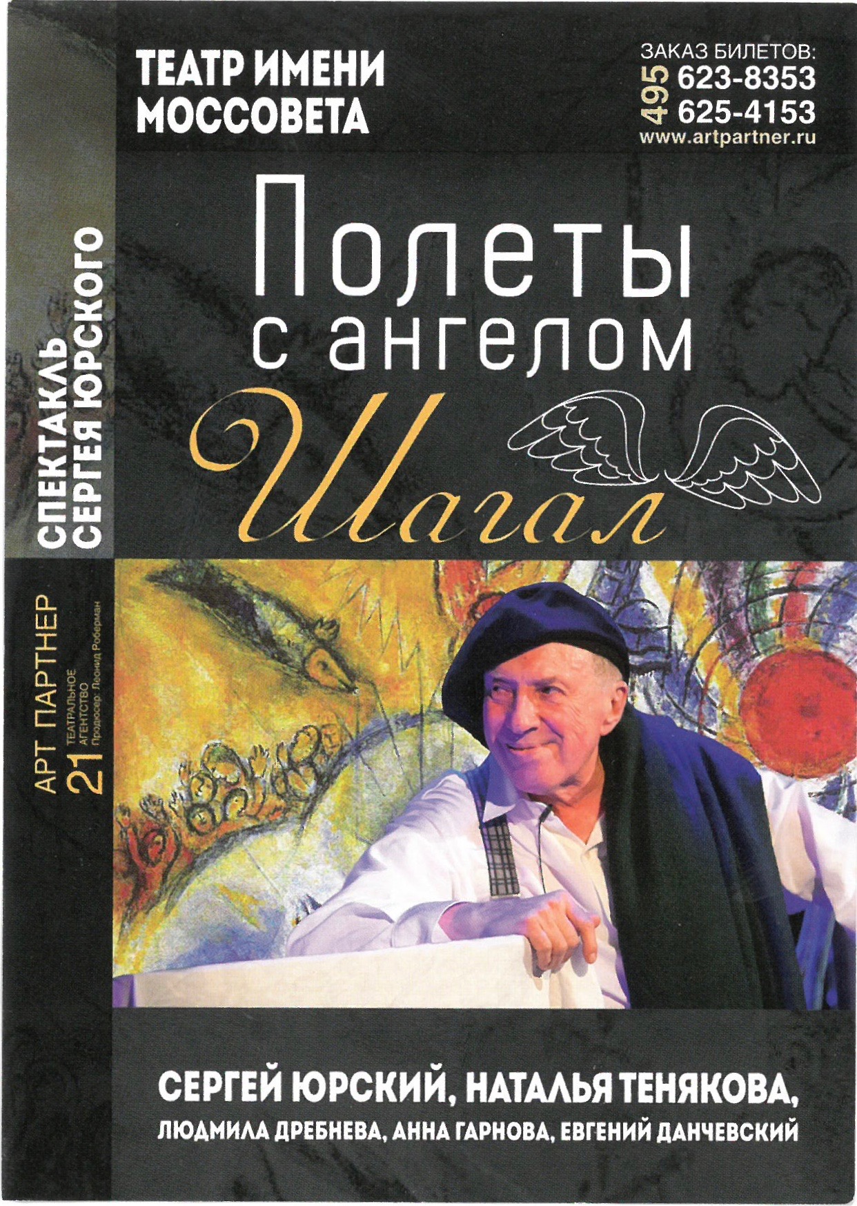 «Полёты с ангелом» З. Сагалова – Шагал, Шмерц, Сандрар, Дядя Исроэл, Бадхен, Луначарский. Постановка С.Ю. Юрского. Театр имени М. Н. Ермоловой и «Арт–партнер — XXI»