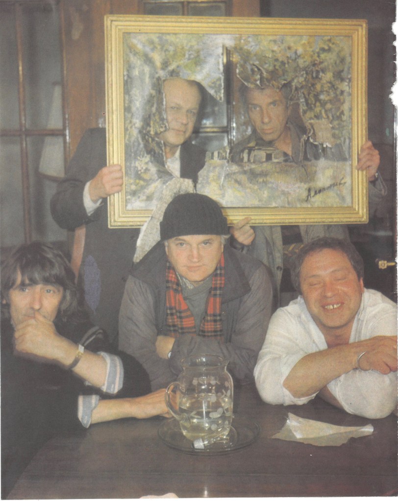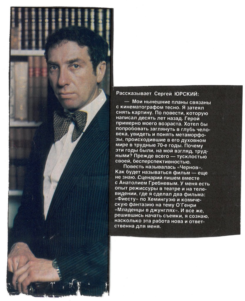 Разные моменты бывают в работе, разное настроение — серьезное и не очень… Вот актеры С. Юрский и П. Щербаков (на снимке они вверху), явно не «вышли» еще из своих ролей; как будто довольны оператор А. Пугачев и драматург В. Славкин; а режиссер И. Райхельгауз, кажется, большего блаженства, чем на этой съемочной площадке, в жизни не испытывал.