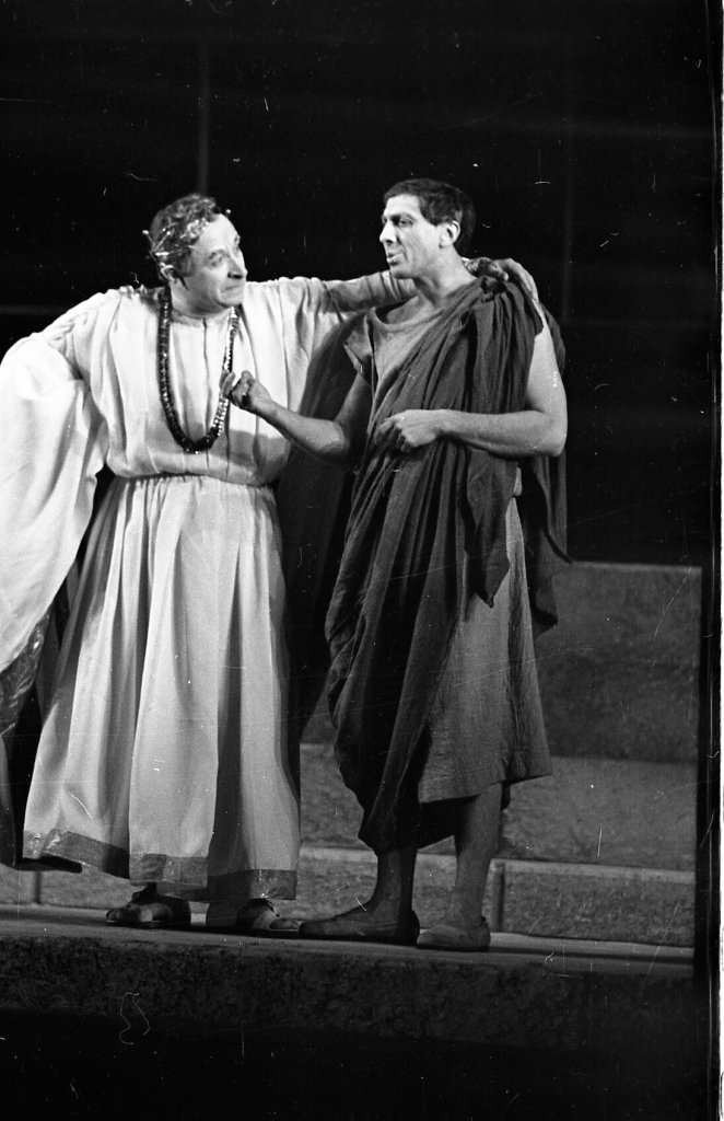 В спектакле Товстоногова был занят звездный состав, только что сыгравший в его же трагичных «Трех сестрах». Возможно, зоринское легкомыслие было им в самый раз для переключения. Задним числом главным парадоксом в распределении ролей выглядит Евгений Лебедев в роли тирана-императора. Можно догадаться, как выглядел сатирик-правдоруб Дион у Сергея Юрского, совсем недавно сыгравшего Чацкого. Понятно, каким вальяжным и неуязвимым мог быть поэт-подхалим Сервилий у Владислава Стржельчика, какой расчетливой и обаятельной гетера Лоллия у Татьяны Дорониной. Но какой же Лебедев император. На фотографиях видно: его Домициан скорее хитрец и прохиндей, чем окаменевший символ вечной власти, скорее демагог, чем тиран.