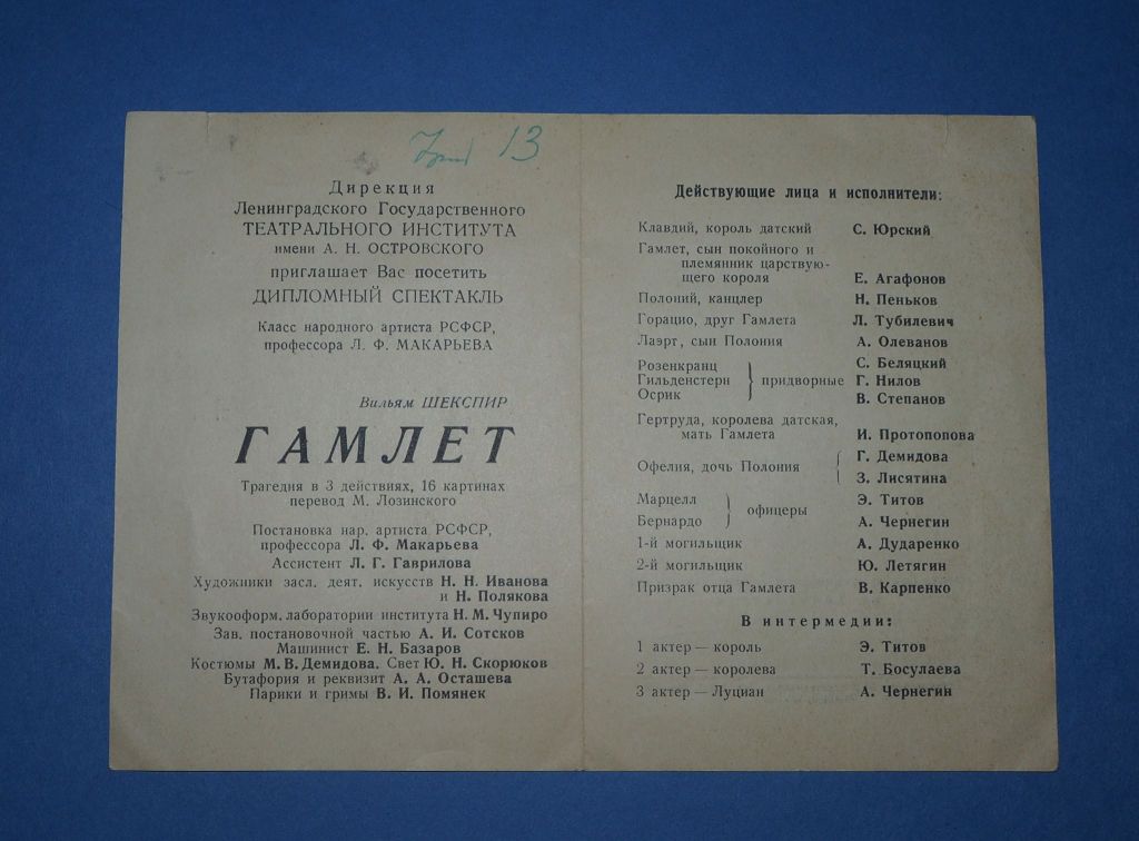 В книге “Кто держит паузу” я уже рассказывал подробно об удивительной театральной студии ЛГУ и ее руководительнице Евгении Владимировне Карповой, о блистательных (без преувеличения!) спектаклях этой студии, замеченных и отмеченных театральным Ленинградом: “Осенняя скука” Некрасова, “Ревизор” Гоголя, “Тартюф” Мольера, “Обыкновенный человек” Леонова, “20 лет спустя” Светлова, “Предложение” Чехова.