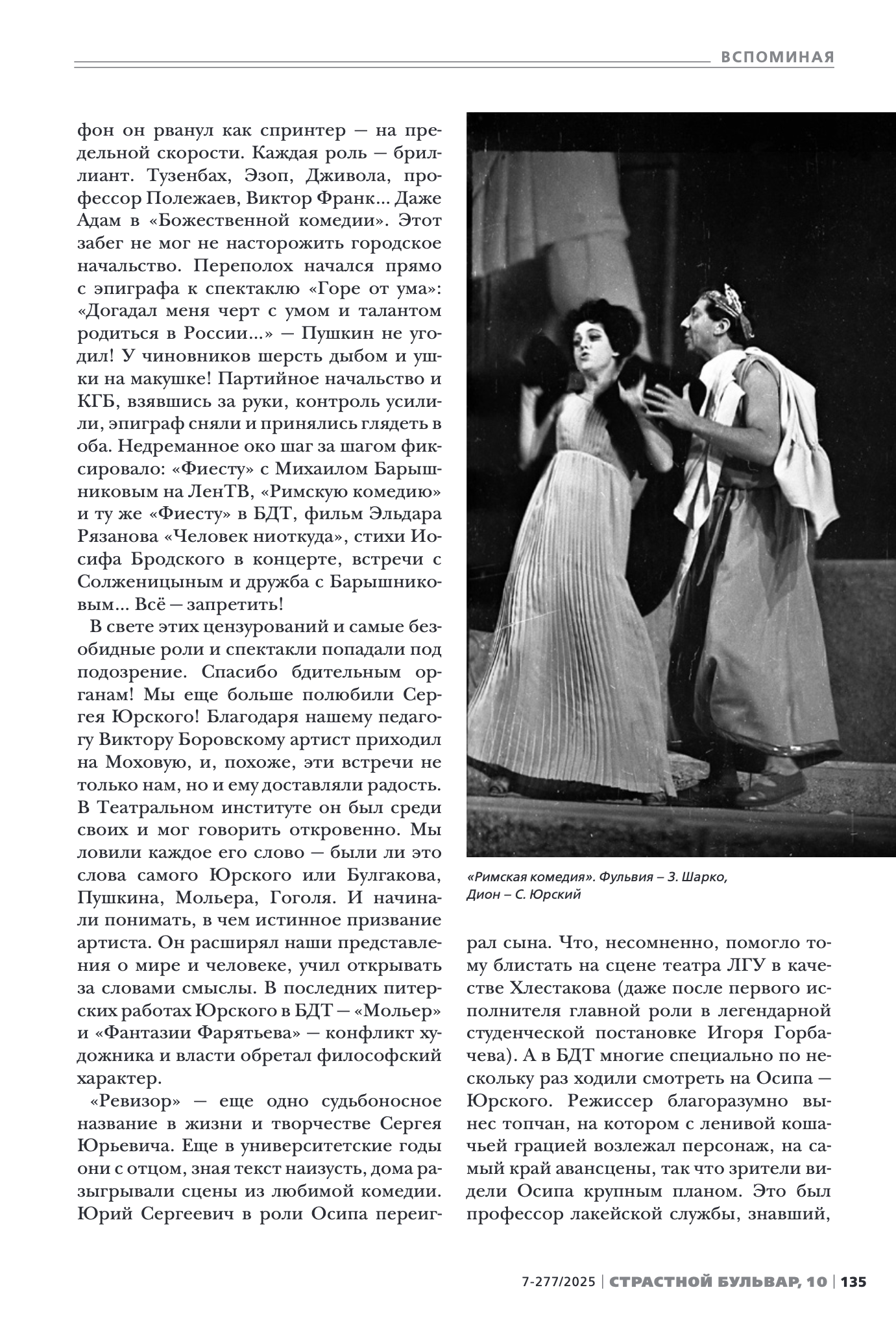 В свете этих цензурований и самые безобидные роли и спектакли попадали под подозрение. Спасибо бдительным органам! Мы еще больше полюбили Сергея Юрского! Благодаря нашему педагогу Виктору Боровскому артист приходил на Моховую, и, похоже, эти встречи не только нам, но и ему доставляли радость. В Театральном институте он был среди своих и мог говорить откровенно. Мы ловили каждое его слово — были ли это слова самого Юрского или Булгакова, Пушкина, Мольера, Гоголя. И начинали понимать, в чем истинное призвание артиста. Он расширял наши представления о мире и человеке, учил открывать за словами смыслы. В последних питерских работах Юрского в БДТ — «Мольер» и «Фантазии Фарятьева» — конфликт художника и власти обретал философский характер.