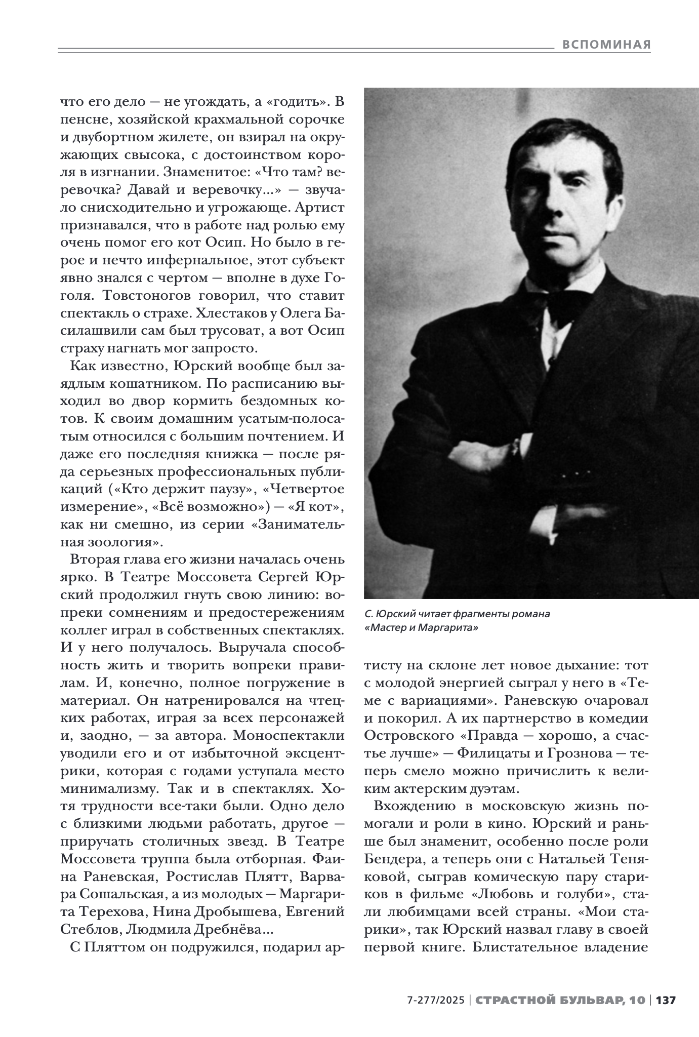 Как известно, Юрский вообще был заядлым кошатником. По расписанию выходил во двор кормить бездомных котов. К своим домашним усатым-полосатым относился с большим почтением. И даже его последняя книжка — после ряда серьезных профессиональных публикаций («Кто держит паузу», «Четвертое измерение», «Всё возможно») — «Я кот», как ни смешно, из серии «Занимательная зоология».