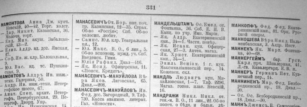 В Адресной книге за 1901 год кожевник Эмиль Витальевич Мандельштам уже живёт на Литейном проспекте,49 — поближе к Тенишевскому училищу, куда поступил учиться его сын.