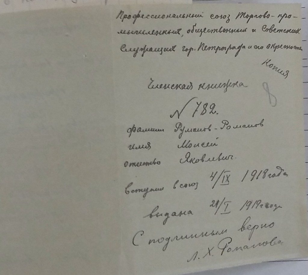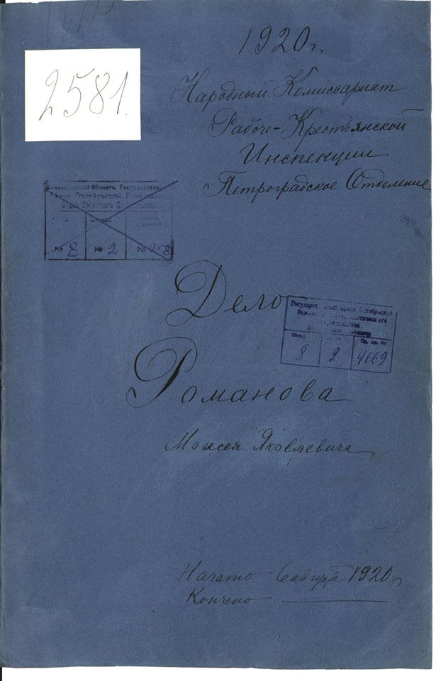 В архиве Петербургского отделения Народного Комиссариата Рабоче-Крестьянской инспекции Константин Пименов нашёл «Дело Романова Моисея Яковлевича», датированное 1920 годом, а в нем прошение и решение по нему: