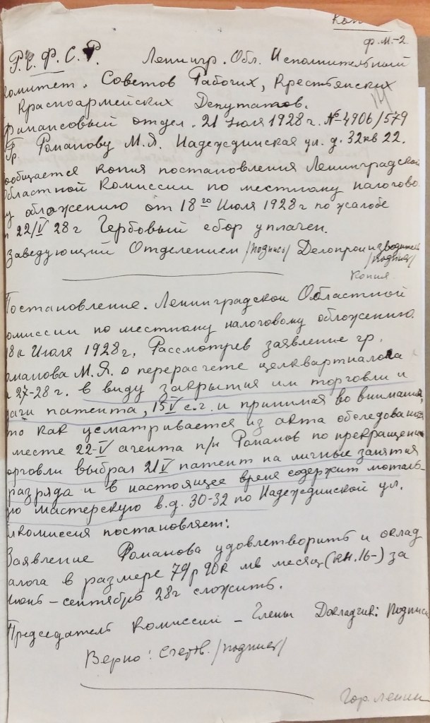 Постановление Ленинградской Областной Комиссии по местному налогообложению от 18 июля 1928г. Рассмотрев заявление гр.Романова М.Я. о перерасчете целквартналога на 27-28 г. в виду закрытия им торговли и сдачи патента 15/V с.г. и принимая во внимание, что как усматривается из акта обследования на месте 22/V агента п/н Романов по прекращении торговли выбрал 21/V патент на личные занятия I разряда и в настоящее время содержит мотальную мастерскую в д. 30-32 по Надеждинской ул., комиссия постановляет: Заявление Романова удовлетворить и оклад налога в размере 79р.90к. в месяц за июнь-сентябрь 28г. сложить.