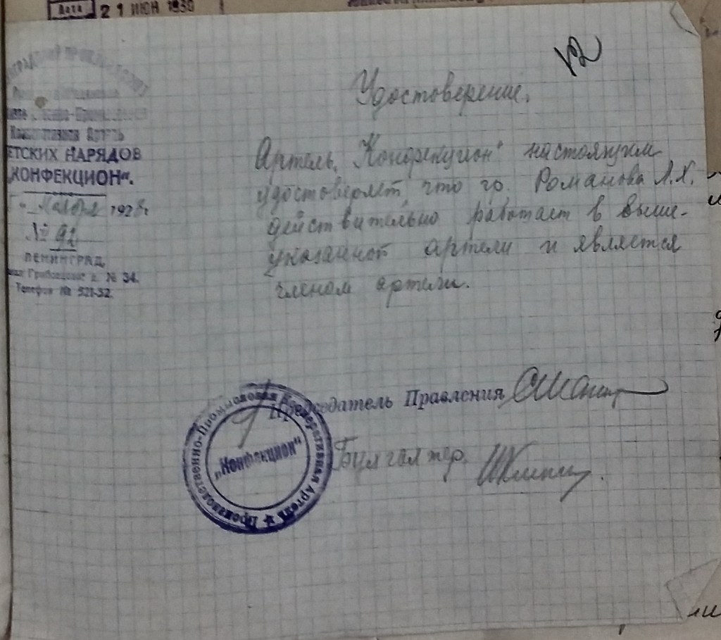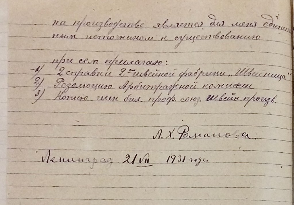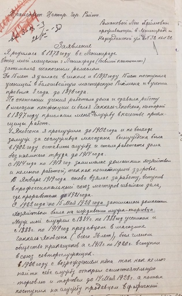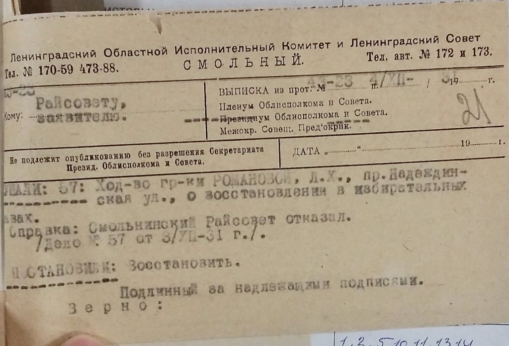 « В связи с лишением меня избирательных прав я в 1930г. была снята с работы, но по постановлению Арбитражной Комиссии при Ленинградском производсоюзе от 26го Апреля 1930г. была восстановлена на работу. В настоящее время вновь поставлен вопрос о снятии меня с работы, как лишенки, но как исполнительную работницу меня временно оставили на работе до выяснения результата моего ходатайства о восстановлении меня в избирательных правах.» (из заявления Л.Х.Романовой в Райсовет Смольнинского района 2 июля 1931 года)