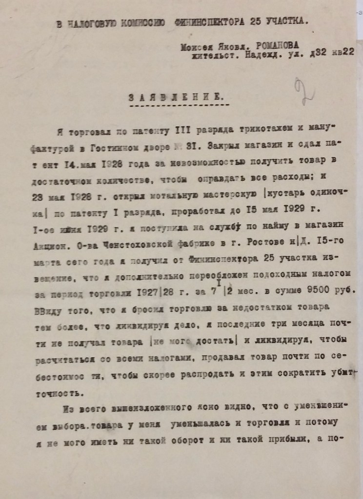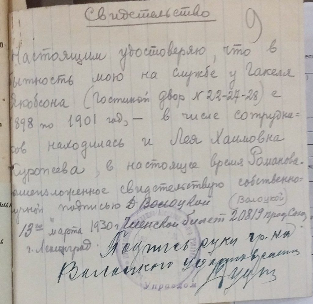 С 1922 года по 15 мая 1928 года занималась домашним хозяйством была на иждивении мужа-торговца. Муж мой служил с 1884г. по 1888 учеником и с 1888 по 1919 продавцом в магазине Гаккель-Якобсона (всего 36 лет), был членом общества прикащиков а с 1918 по 1920 вступил в союз совторгслужащих. В 1922 году с возрождением нэпа так как не мог найти себе службу открыл самостоятельную торговлю и торговал до 14 мая 1928 г. а потом поступил на службу продавцом в фабричный магазин Акц. общ. Ченстоховской фабрики в г.Ростов н/Д.