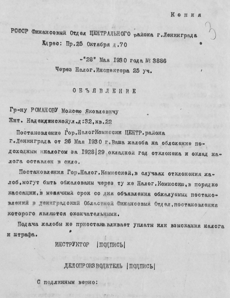 «Постановление Гор.НалогКомиссии ЦЕНТР. района г. Ленинграда от 26 Мая 1930 г. Ваша жалоба на обложение подоходным «налогом за 1928|29 окладной год отклонена и оклад налога оставлен в силе.«