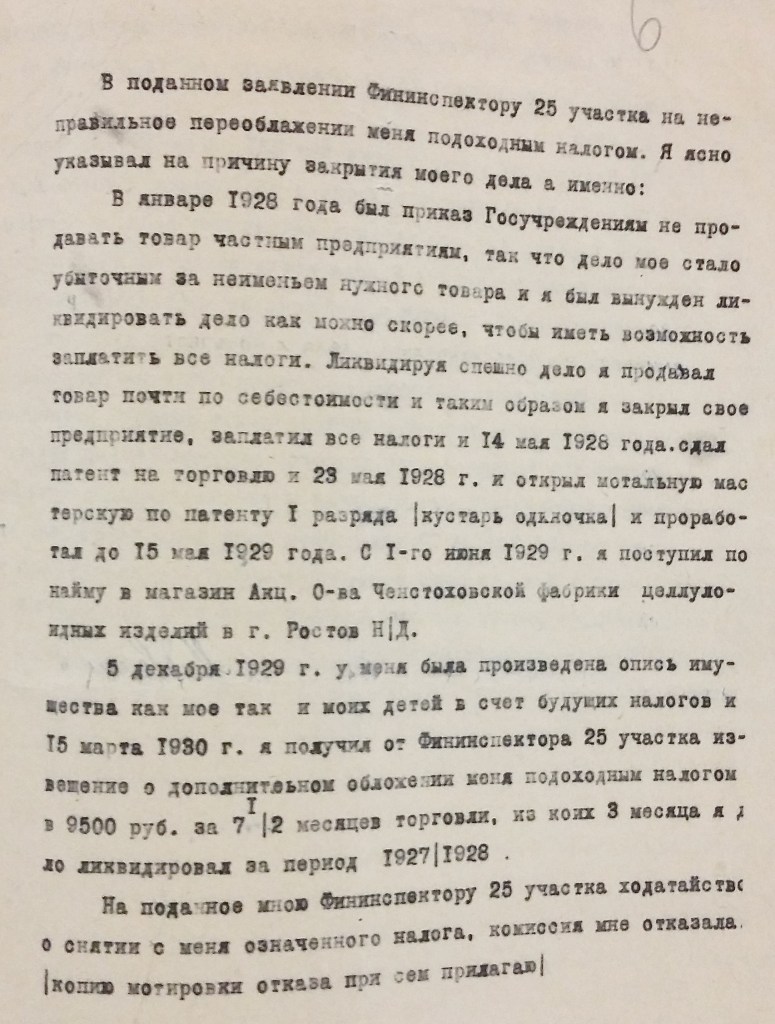 5 декабря 1929 г. у меня была произведена опись имущества как мое, так к моих детей в счет будущих налогов я 15 марта 1930 г. я получил от Фининспектора 25 участка извещение о дополнительном обложении меня подоходным налогом в 9500 руб. за 7 1/2 месяцев торговли, из коих 3 месяца я дело ликвидировал за период 1927/1928.