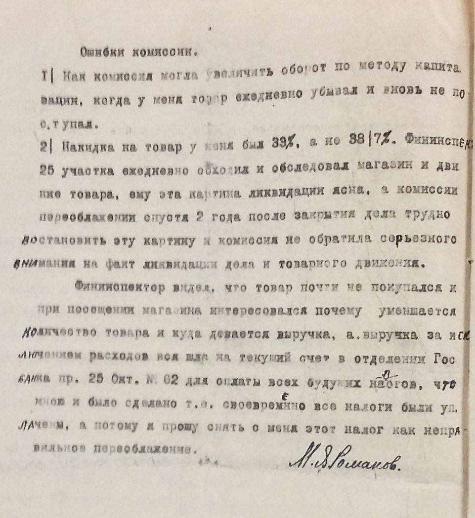 Фининспектор видел, что товар почти не покупался и при посещении магазина интересовался, почему уменьшается количество товара и куда девается выручка, а выручка, за исключением расходов вся шла на текущий счет в отделении Госбанка пр. 25 Окт, №62 для оплаты всех будущих налогов, что мною и было сделано, т.е. своевременно все налоги были уплачены, а потому я прошу снять с меня этот налог как неправильное переобложение