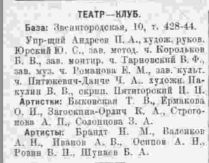 В какое-то время между 1926м и 1930 годом в квартире появился ещё один жилец , Юрий Сергеевич Юрский (они с Евгенией Михайловной зарегистрировали брак в 1930м, но на свидетельстве о рождении Сергея Юрского в 1935м году стоит пометка, что Юрий Михайлович проживает по этому адресу уже 8 лет — получается, с 1927ого). В адресной книге 1928 года Театр-клуб уже существует, но руководят им другие люди, а в 1930 там «худож. руков. Юрский Ю.С»., а «зав. муз. ч. Романова Е.М.«
