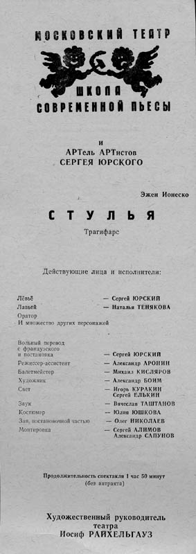 Освободившись от цензуры, наши театры совершенно естественно захотели «заполнить лакуны», обратившись к запрещенным ранее пьесам абсурдистов. И оказалось, что для того, чтобы постановки этих пьес стали фактом не только личной биографии режиссеров и актеров, но и зрителей, свободы от цензуры недостаточно. Нужна еще и внутренняя свобода художника, которой в полной мере обладает Сергей Юрский — постановщик «Стульев». «Не трагическими, а освобождающими кажутся открытия абсурда, история которого ведет нас от одной пропасти в другую, подхватывая на лету», — написал в своем эссе «Вид из окна» Александр Генис. Подобное «освобождающее открытие» ждет зрителей на этом спектакле в стенах театра, название которого «Школа современной пьесы» по отношению к «Стульям» Ионеско звучит весьма символично.