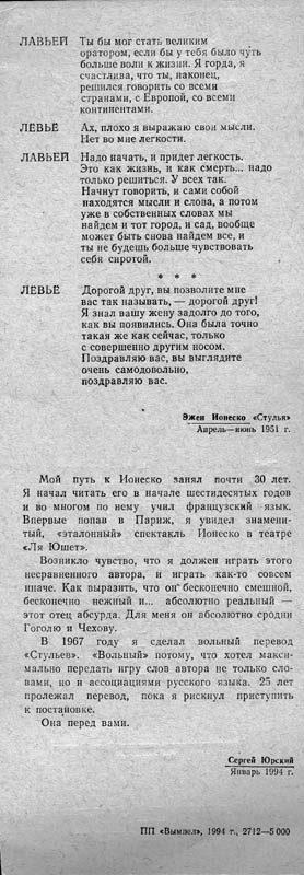 Совершенно очевидно, что Юрскому-режиссеру неоценимые услуги оказал Юрский-переводчик, обладающий удивительным чувством слова и стиля, нигде и ни в чем не предающий автора. А если он и позволяет себе некоторые от него «отступления», то делает это совершенно в духе Ионеско (так, при обсуждении со Старухой «списка» приглашенных Старик у Юрского вместо написанного у Ионеско «шелкоперы» произносит «театральные критики»: и от первоисточника недалеко и отражает сложные отношения Сергея Юрьевича с пишущей братией!). Мне кажется, что впервые мы получили удачный перевод «Стульев» не только потому, что он во многом сделан, исходя из ритма и динамичности спектакля и из актерских возможностей, но и прежде всего потому, что переводчик не «домысливал» за автора, чем так грешит большинство русских переводов текстов «театра абсурда». То ли от поверхностного знания языка, то ли от лености и равнодушия, некоторые переводчики «абсурдистов» вероятно полагают, что чем глупее и непонятнее окажется русский текст, тем больше он будет соответствовать оригиналу. «Стульям» тут как-то особенно «повезло». Чего стоило, например, в одном из переводов этой пьесы, упоминание Старухой в разговоре с одной из «гостий», что ей известен «рецепт крепдешина», в то время как у Ионеско речь идет о «блинчиках по-китайски» (во французском «сгёре de Chine»).