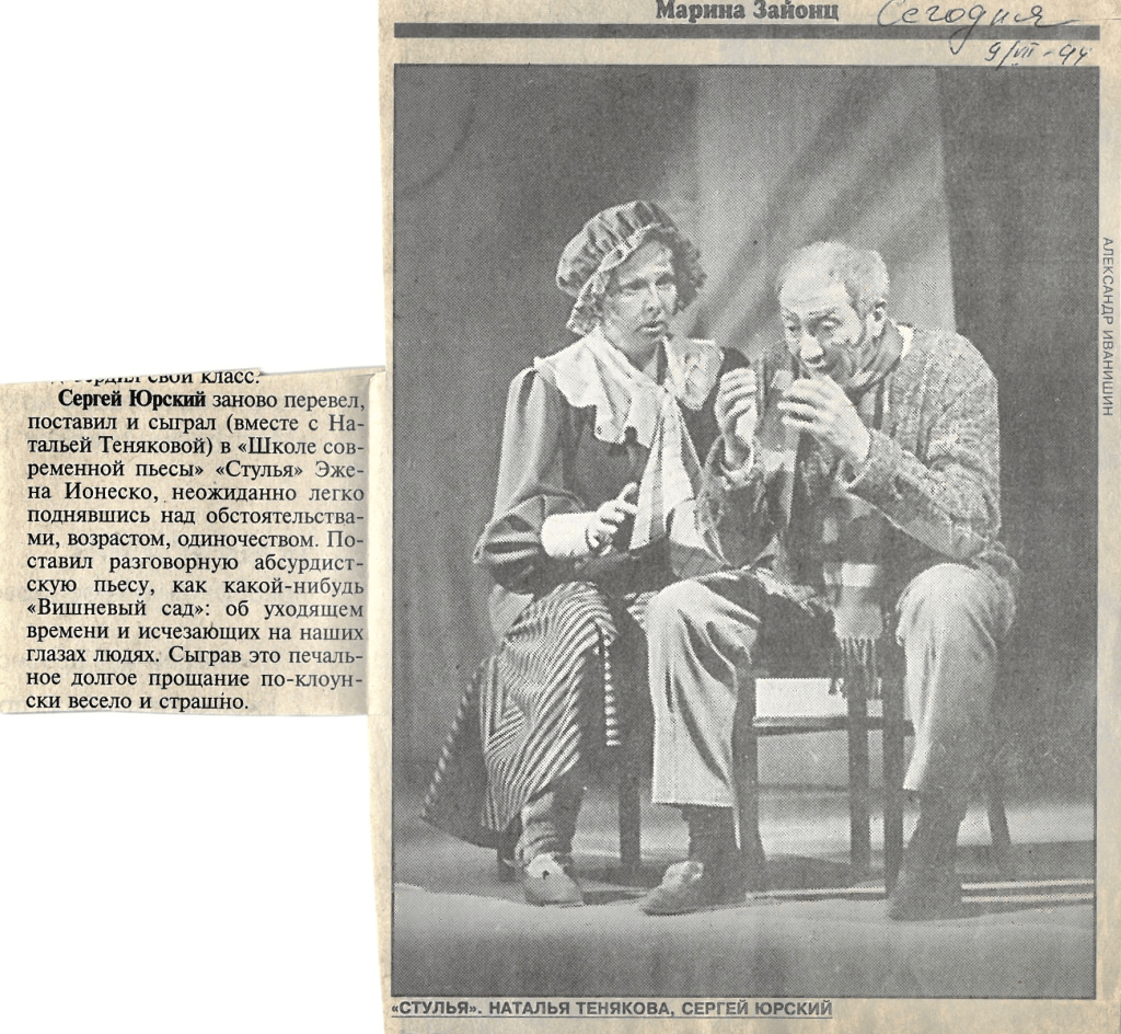 Татьяна Проскурникова. Искусство жить в абсурдном мире. «Стулья» Эжена Ионеско в постановке Сергея Юрского. Независимая газета, 1 марта 1994.