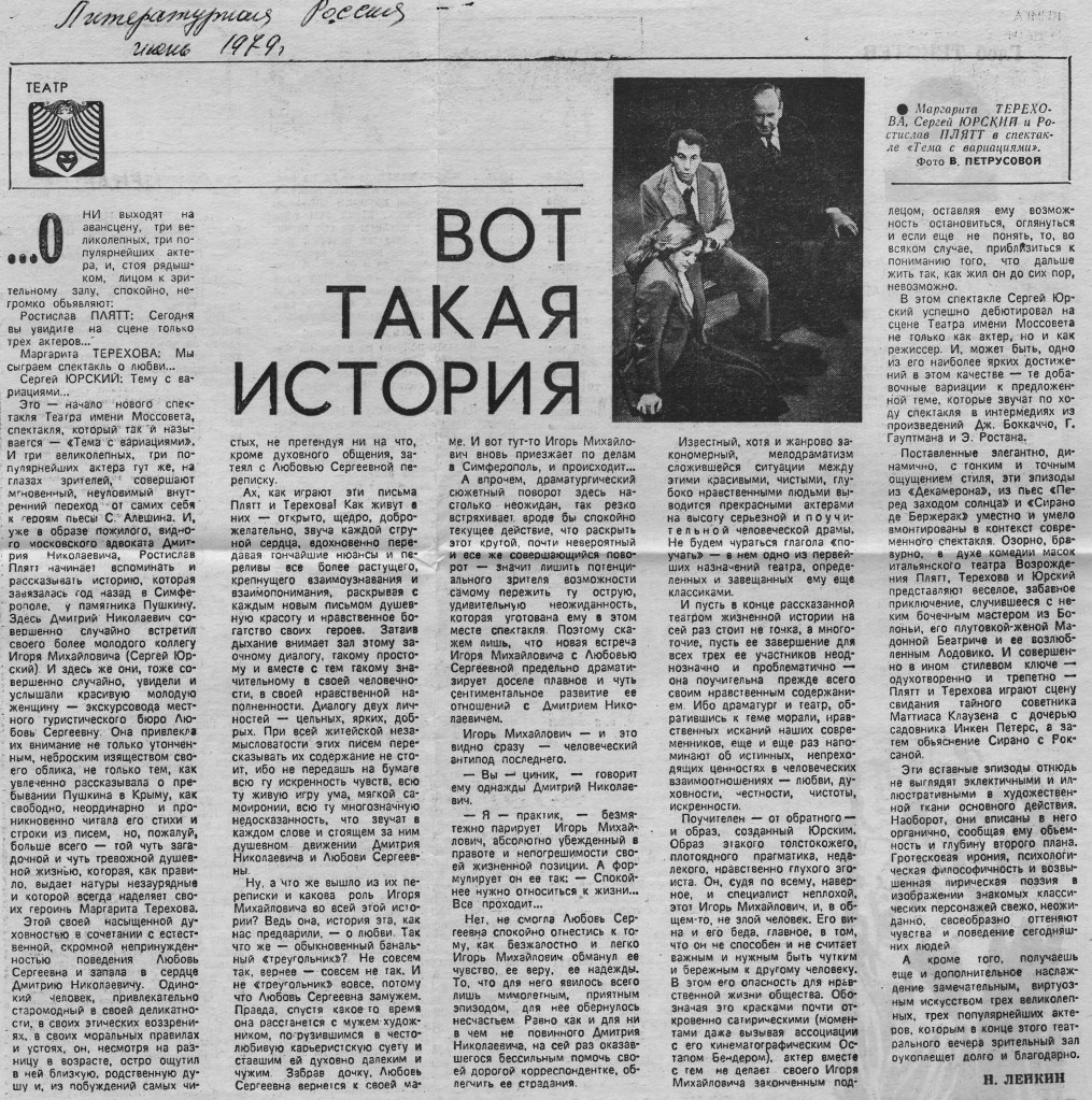 - Впервые на московской сцене. Вечерняя Москва. 25 апреля 1979 года.
