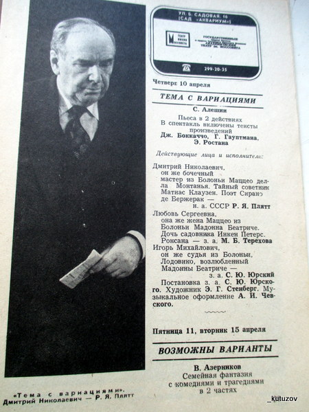 Спектакль, о котором пойдет речь, отмечен именами, способными украсить любую афишу: Ростислав Плятт, Маргарита Терехова, Сергей Юрский в спектакле «Тема с вариациями», поставленном Сергеем Юрским по пьесе С. Алешина.