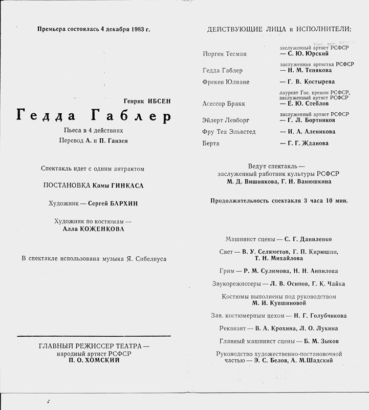 «Гедда Габлер» Генрика Ибсена. Сергей Юрский – Йорген Тесман. Постановка Камы Гинкаса. Театр им. Моссовета. Премьера состоялась 7 декабря 1983 года.