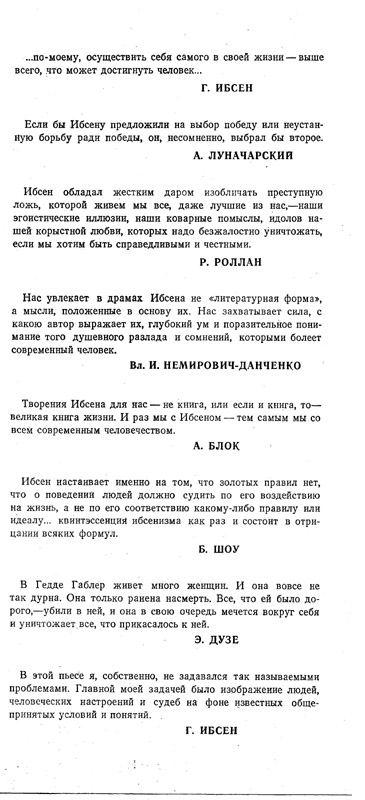 Год спустя после премьеры спектакля «Гедда Габлер», весьма путано отраженного в нашей критике, я прочитала большую статью Юрского «Играем Ибсена». Это серьезное исследование теперь опубликовано в журнале «Вопросы литературы». Юрский не спорит с критиками и не настаивает на переоценке спектакля. Он только рассказывает о том, какая работа предшествует выходу актера на сцену. Следует добавить — не всякого актера. Далеко не все сценические открытия достигаются таким путем. Юрский тут не идеал и не образец, скорее — исключение. Повторяю: мы имеем перед собой исключение, в котором отражаются и подтверждают себя общие правила.»