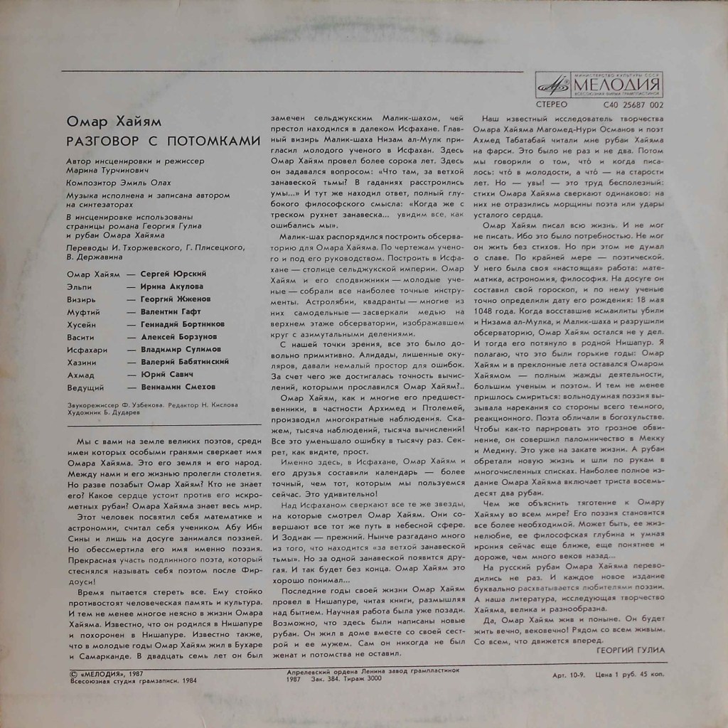 Автор инсценировки и режиссер Марина Турчинович, музыка Эмиля Олаха; В инсценировке использованы страницы романа Георгия Гулиа и рубаи Омара Хайяма в переводах И. Тхоржевского, Г. Плисецкого, В. Державина. Предисловие на конверте пластинки — Георгий Гулиа. Редактор: Наталья Кислова. Композитор: Эмиль Л. Олах. Звукорежиссёр: Ф. Узбекова. Зап.: 1984г. С40 25687 002