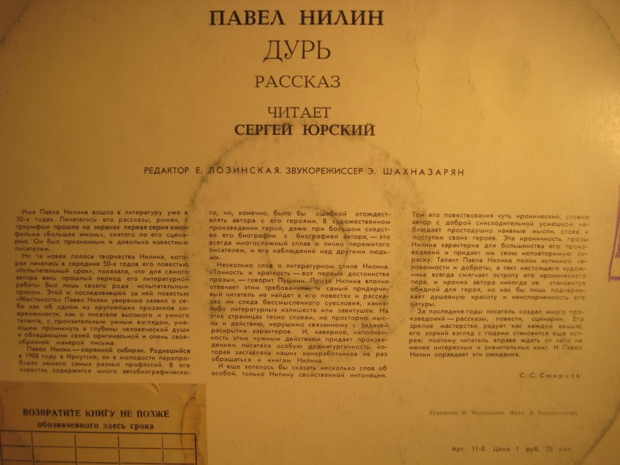 Фирма «Мелодия» М50-40491-21977. Автор сценария И.Глоцер. От автора — З. Гердт. Стихи и сказки Д. Хармса читают Р. Зеленая, Р. Плятт, С. Юрский, А. Папанов