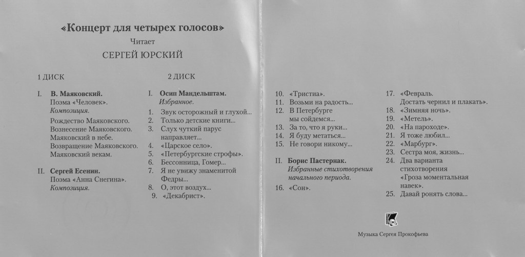 2001 Концерт для 4-х голосов Читает Сергей Юрский (2 диска). В.Маяковский «Человек», С. Есенин «Анна Снегина», стихи О.Мандельштама и Б.Пастернака.