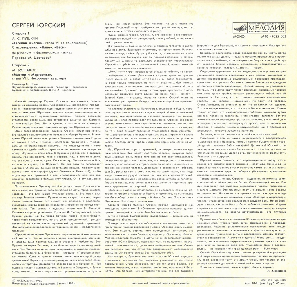 1986 LP Сергей Юрский. А. Пушкин. «Евгений Онегин». Глава VI / М. Булгаков»Мастер и Маргарита». Глава VII.