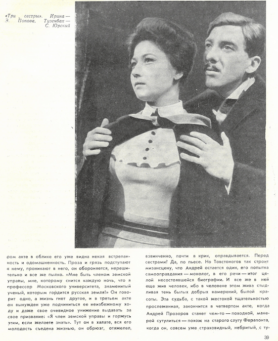 Напротив, Ирина, в которой привыкли (по подсказке Чебутыкина) видеть «белую птицу» радостной и несокрушимой надежды, в спектакле Товстоногова быстро и горестно увядает. Э. Попова прочерчивает точную и решительную линию движения от девической мечтательности к горькой и скромной трезвости. Самая молодая, она стареет и дурнеет быстрее всех, она больше других подвластна времени, ибо путь ее самый прямой: сверху вниз. Г. Товстоногов и актриса достаточно твердо возражают критикам (от Н. Эфроса до А. Роскина), упрекавшим Чехова в «некоторой расплывчатости», «неопределенности» образа младшей сестры. Ирина этого спектакля определенна донельзя. В ней — самая четкая, исчерпывающе ясная вариация темы гибнущей красоты. В ней погибает красота юности, поэзия юности. В ней умирают мечты. Тема Э. Поповой вступает в настойчивое и последовательное противоречие с темой С. Юрского — Тузенбаха, с его возбужденной мечтательностью. Ее судьба шаг за шагом опровергает его иллюзии. Вдохновенный труд, о котором он говорит, приносит Ирине тягость и изнурение постылой работы. Любовь, о которой он мечтает, в конечном счете сводится для Ирины к вынужденному компромиссу, к Тузенбаху, которого она не в состоянии полюбить. Страдая до изнеможения, она мукой всей своей загубленной молодости завоевывает себе только одно последнее право и последнее убежище: возможность видеть жизнь такой, какая есть, без иллюзий, называть вещи своими именами. Начинает спектакль восторженно и кончает без всякой надежды.