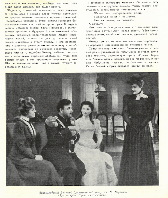 С точки зрения таких опасений опыт, предпринятый Г. Товстоноговым в Большом драматическом театре, приобретал значение огромной важности. Осуществляя постановку «Трех сестер», Товстоногов неизбежна шел на сопоставление его спектакля со знаменитым спектаклем Вл. И. Немировича-Данченко, пусть теперь уже померкшим и многое утратившим, но хорошо памятным во всем блеске его относительно недавней новизны. Со спектаклем, где чеховское торжествовало во всем — в ансамбле, в ощущении быта, в высокой и всеобъемлющей поэзии целого. Причем, затевая постановку «Трех сестер», Товстоногов вовсе не отмежевывался и не отнекивался от традиций Художественного театра. Напротив, он обнаружил полную готовность следовать этим традициям. Тем острее и тем опаснее выглядел задуманный эксперимент. Ибо от его исхода во многом зависел ответ на вопрос о сегодняшней жизненности чеховских пьес.