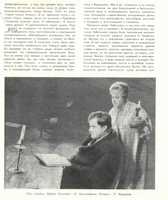 Прошлым живет Чебутыкин, и как оно, это прошлое, мучит его и корежит!.. В мизансценическом рисунке Чебутыкину задана боль трагических мечтаний, которую не вполне удается выразить Н. Трофимову. Фигура эта, к сожалению, сдвигается во второй план. В ней видится горечь одинокой и неприютной старости, видится мучительная верность давней любви — верность красоте, однажды осенившей долгую жизнь, но не проступает другое, не видна, очевидная Чехову, страшная сила ушедшей и невозвратимой красоты, а ведь именно она-то и выводит Чебутыкина из равновесия, она-то и вышибает полкового доктора из круга банального бытия. Об этом, вероятно, думал Товстоногов, когда заставил пьяного Чебутыкина с остервенением стирать собственное отражение в зеркале. Пьяный, он пытается уничтожить собственную банальность. Трезвый, вычитывает из газет какие-то извещения о чуме в Цицикаре и спорит с Соленым о черемше и чехартме… Впрочем, и трезвый, он знает, что глупо жить, как люди живут, и советует Андрею: «Надень шапку, возьми в руки палку и уходи… уходи и иди, иди без оглядки». Рядом с Андреем, утопающим в трясине банальности, Чебутыкин чувствует себя счастливцем.