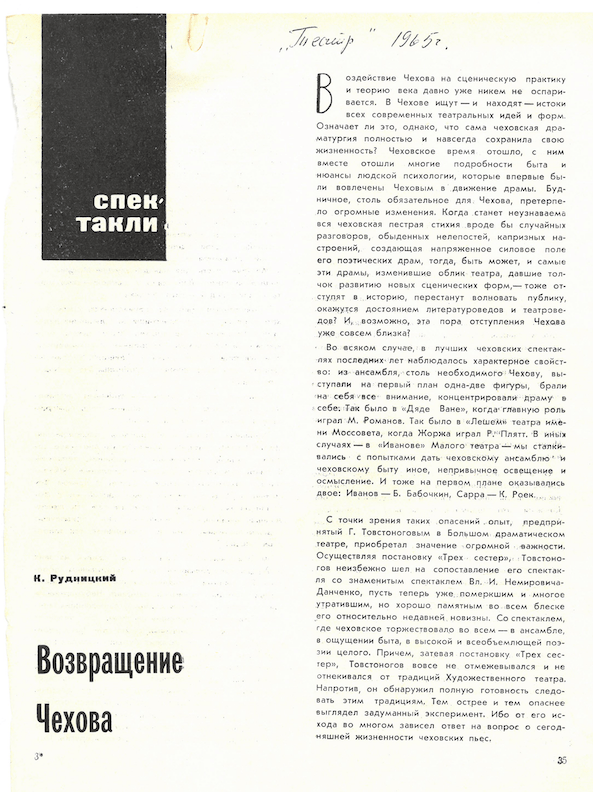 К. Рудницкий. ВОЗВРАЩЕНИЕ ЧЕХОВА. «Театр», 1965, № 5