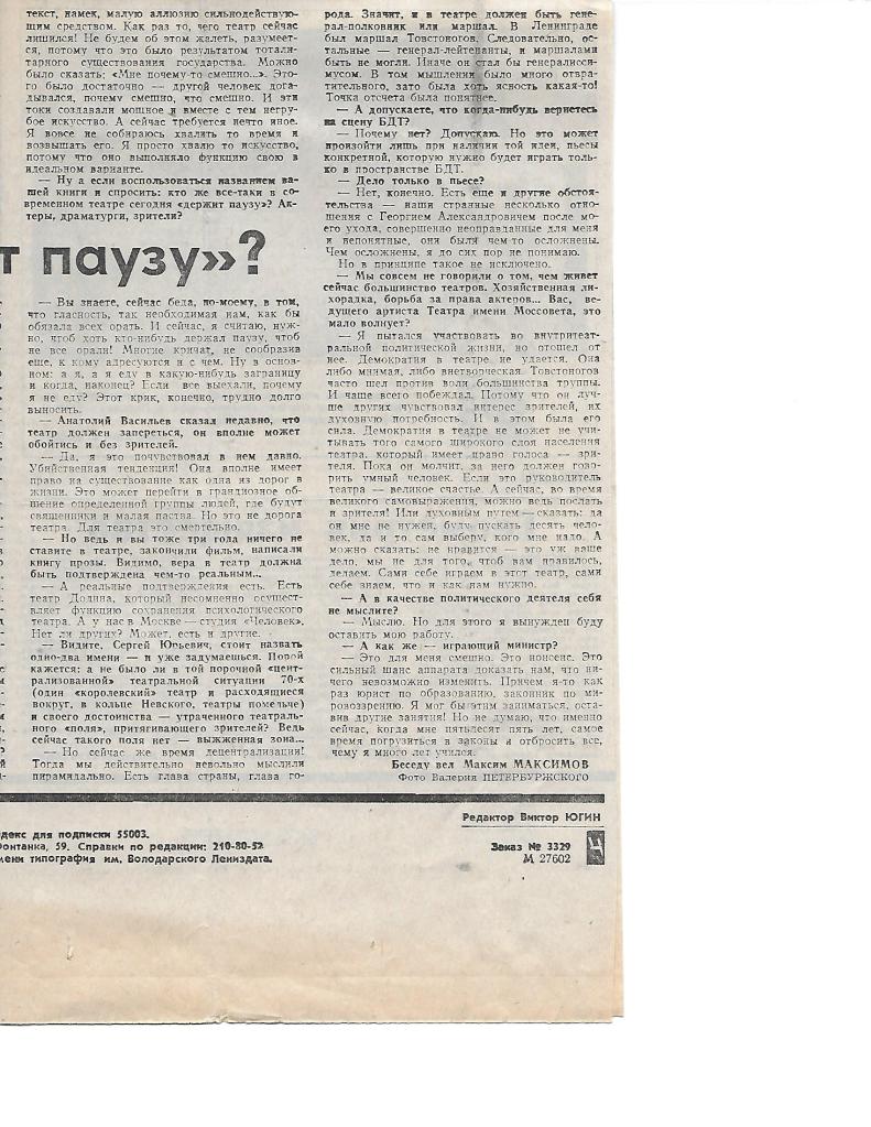 С.Юрский. Так кто же «держит паузу»? -Беседу вел Максим Максимов. Смена, 27 марта 1990 года