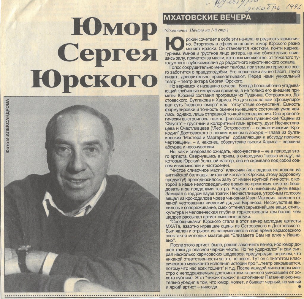 Московский художественный театр имени А.П. Чехова возобновляет давнюю традицию мхатовских вечеров, обещая, что на прославленную сцену в канун ее 100-летия будут выходить лучшие представители отечественного искусства. Вечер Сергея Юрского назывался “Классика черного юмора», и в самом названии как бы соединились требования высокого искусства с модными настроениями сегодняшнего дня.
