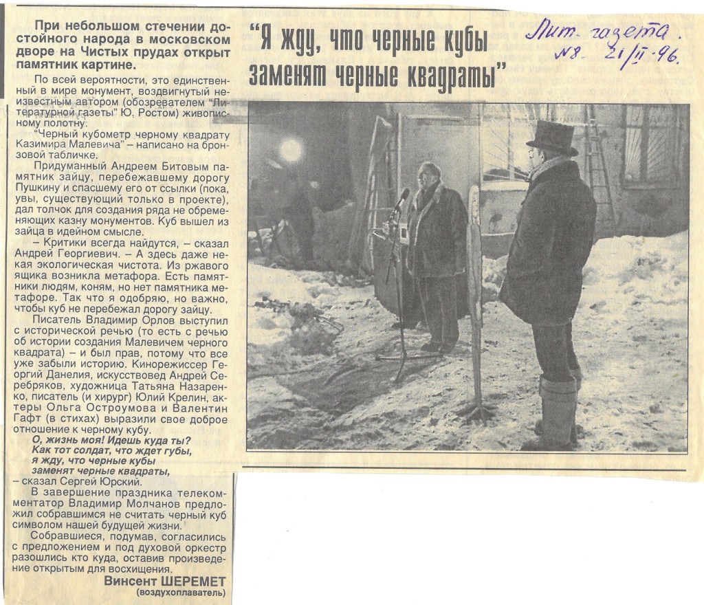 Винсент Шеремет «Я жду, что чёрные кубы заменят чёрные квадраты» — Литгазета, 21/02/1996 Поделиться ссылкой: Нажмите, чтобы поделиться в X (Открывается в новом окне) X Нажмите, чтобы открыть на Facebook (Открывается в новом окне) Facebook Нравится Загрузка...