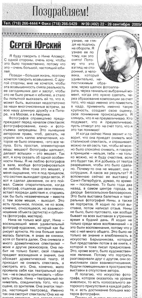 И когда сейчас Нина звонит и говорит. что она приедет снимать мой сталинский спектакль, и спрашивает, можно ли ей сесть так, чтобы ей можно было спокойно снимать, я говорю: в принципе — нельзя, тебе — не только можно, но я буду счастлив, если это будет так. И я добьюсь от театра разрешения, чтобы это было сделано. Почему-то она не мешает, она — сотрудник. А каков же результат? Я вспоминаю сейчас ее выставку в Санкт-Петербурге, думаю, по времени — последнюю. То было года два назад, в самом центре города, во дворце Белосельских-Белозерских. Это была выставка балетных и театральных фотографий Нины, а также ее портретов. Я ходил по этой выставке, потом написал отзыв. Нины не было, было пустовато, как вообще бывает на всех выставках в утреннее время в будний день. Я ходил не только среди моих воспоминаний — а это были воспоминания, потому что у нас с ней много общего. Это было не только ее знание и влюбленность в искусство Барышникова, который был представлен потом в ее книге, к которой я тоже писал предисловие. Это, кроме всего, было художественное явление. Потому что портреты разговаривали друг с другом, они осмысливали свои взаимоотношения, будучи помещенными в пространство выставки в отсутствие автора.