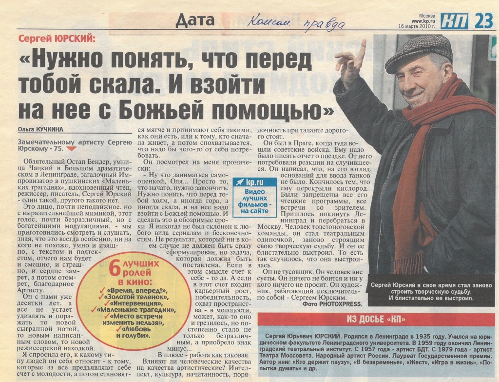Ольга КУЧКИНА Сергей Юрский: «Нужно понять, что перед тобой скала, и на нее надо взойти с Божьей помощью” — Комсомольская правда, 16 марта 2010.