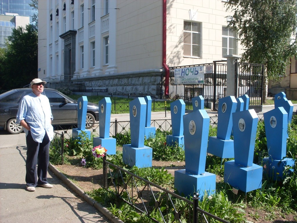 Я предложил зайти в музей Невьянской иконы (судя по надписи на одной из книг, он не расслышал — написал Неньянской, и в эфире Эха Москвы так же сказал). Ничего не зная ни о музее, ни об этой школе иконописи, СЮ доверился мне. Жара, еще не сильная, и духота. На подступах к музею — кладбище архитектурных памятников, где мы задержались: произвело впечатление. Потом музей, а на табличке — работает с 11. Я сказал уборщице: «Вы открыты, оказывается, с 11, но со мной человек, который приехал из Москвы на короткое время, и позже он не сможет, а я его убедил, что тут надо побывать — пустите? Еще не видя, с кем я, ответила: «Конечно. Я на втором этаже сейчас свет включу». Тут же появилась девочка, которая узнала, но первое впечатление — что именно людей с улицы запустили в нерабочее время. Это подкупает и что-то говорит об атмосфере в музее. Поднялись, смотрели, СЮ понял, что я его не куда попало привел, но душно, он весь взмок, да еще больной… Когда уже хотели уходить, пришла экскурсовод, и еще какое-то время смотрели и слушали. СЮ оставил запись в книге отзывов. Я ему купил на память 4 открытки репродукций икон. На первом этаже посмотрели наивное искусство, где я сначала узнал по манере, а потом и убедился, прочитав подпись: Коровкин, тот самый, который у дяди Вити: «Красный на коне, а белый в земле». Там много его работ.