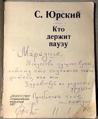 И.Ц. (читает) «Дорогому Маркуше с посвящением и пожеланием напутствия самого лучшего. Твой Юрский. Москва 2003 год».