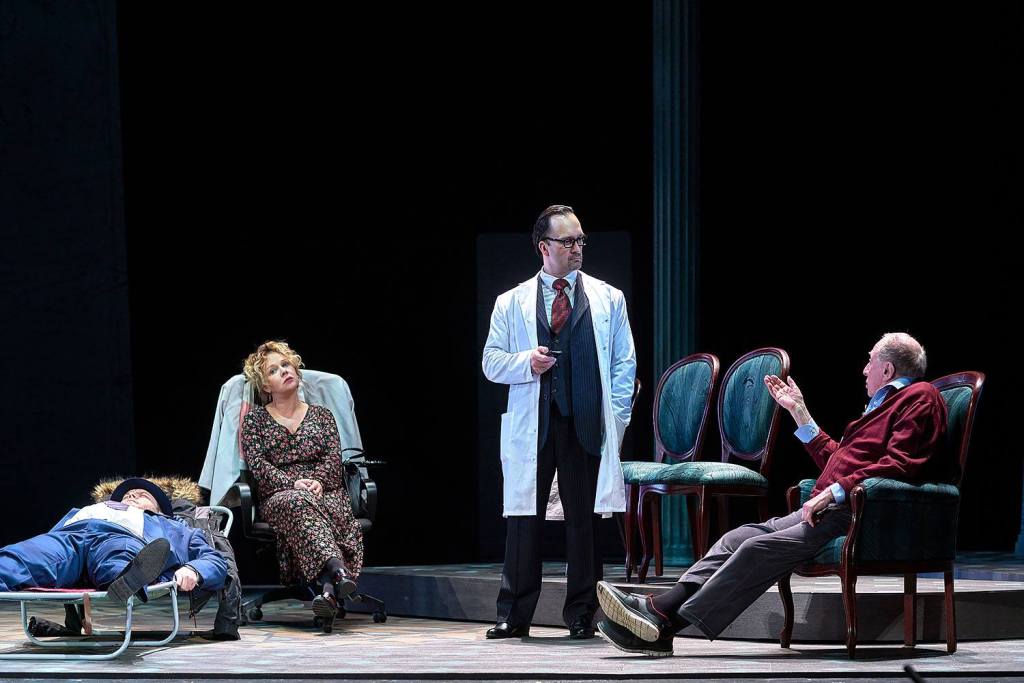Но одно дело, когда в зале пять рядов и небольшая сцена «Под крышей», на которой играются спектакли «Полонез, или Вечер абсурда» и «Предбанник». Другое дело, выходить на тысячную сцену театра имени Моссовета со своей новой пьесой-абсурдом. Это определенный риск, с которым, надо заметить, Юрский и справляется, и нет. Потому что он себе не изменяет, делая то же самое со своей привычной командой. В ней Юрий Беркун, который давно не выходил в новых ролях в театре им. Моссовета. Это Людмила Свитова, Анна Гарнова. Правда, в нее добавилась Елена Валюшкина – звезда нынешних сериалов и кино, получившая новый виток в карьере после выхода на экраны фильма Жоры Крыжовникова «Горько» (2013), где она сыграла маму главной героини Юлии Александровой. Но до этого Елена Валюшкина прославилась в роли Марии Ивановны/нимфы в художественном телефильме Марка Захарова «Формула любви» (1984). Так что с кино у нее почти 30 лет ничего не складывалось. Но в театре Моссовета она всегда была на хорошем счету. Хотя в последние годы она вообще не выходила на основную сцену театра. И, наконец, Юрский ее увлек материалом. И она снова на большой сцене.