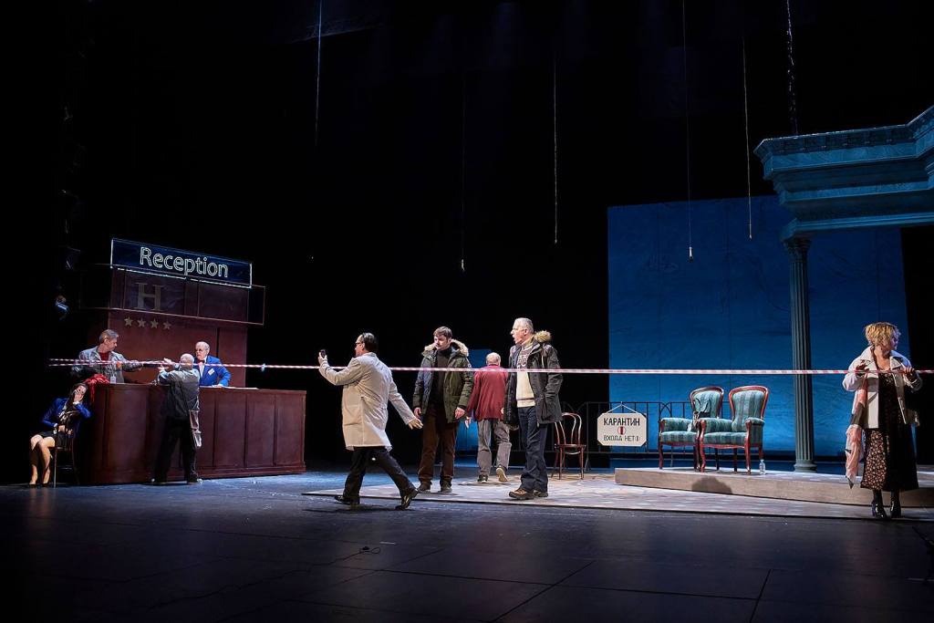 Громкоговоритель сообщает, что отель стал эпицентром распространения загадочной инфекции. На сцене появляются красно-белые заградительные ленты, складные стулья, раскладушки. Респектабельный отель с внушительной стойкой ресепшна и массивными кожаными креслами в мгновение ока превращается в подобие бомбоубежища, населенного разными людьми. Говорливый врач-эпидемиолог (Роман Кириллов), пожилой портье (Юрий Беркун), юная администраторша (Людмила Свитова), сотрудники секретной службы, обыкновенные рабочие… Все хотят отсюда вырваться, но ни у кого не получается. Более того, с колосников доносится голос, еще более нервирующий карантинных узников.