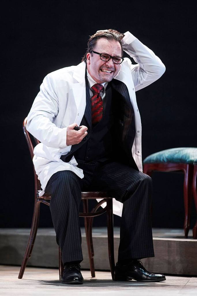 После крутой завязки на сцене обнаруживаются почти беспрерывно вещающие персонажи. В какой-то момент слова начинают рассыпаться, как бусины с нитки, и, дробясь и отскакивая, разлетаются бессмысленным набором звуков. От концентрации событий и персонажей возникает напряжение, от обилия слов – страх. При этом герои на сцене ничего толком не делают, финал вообще открыт, никто морали не изрекает, и все стремительно куда-то несется. За происходящим почти невозможно уловить момент, когда звучит разгадка. Это происходит еще в первом акте, но безумия вокруг столько, что никто в нее не верит.