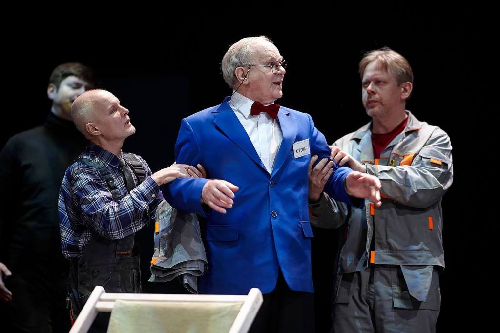 Текст в пьесах Игоря Вацетиса, и раньше родственный Эжену Ионеско и театру абсурда, в “Reception” звучит с интонацией Салтыкова-Щедрина, едко и почти безнадежно. И щедринское же: “Страшно, когда человек говорит и не знаешь, зачем он говорит, что говорит и кончит ли когда-нибудь” – становится лейтмотивом спектакля.